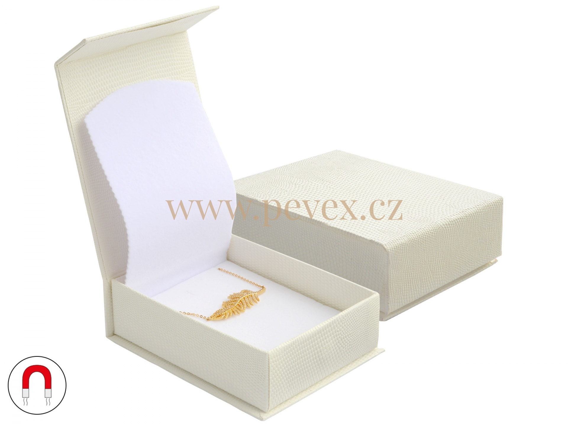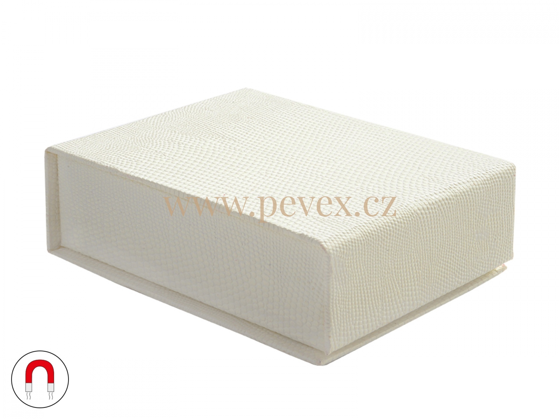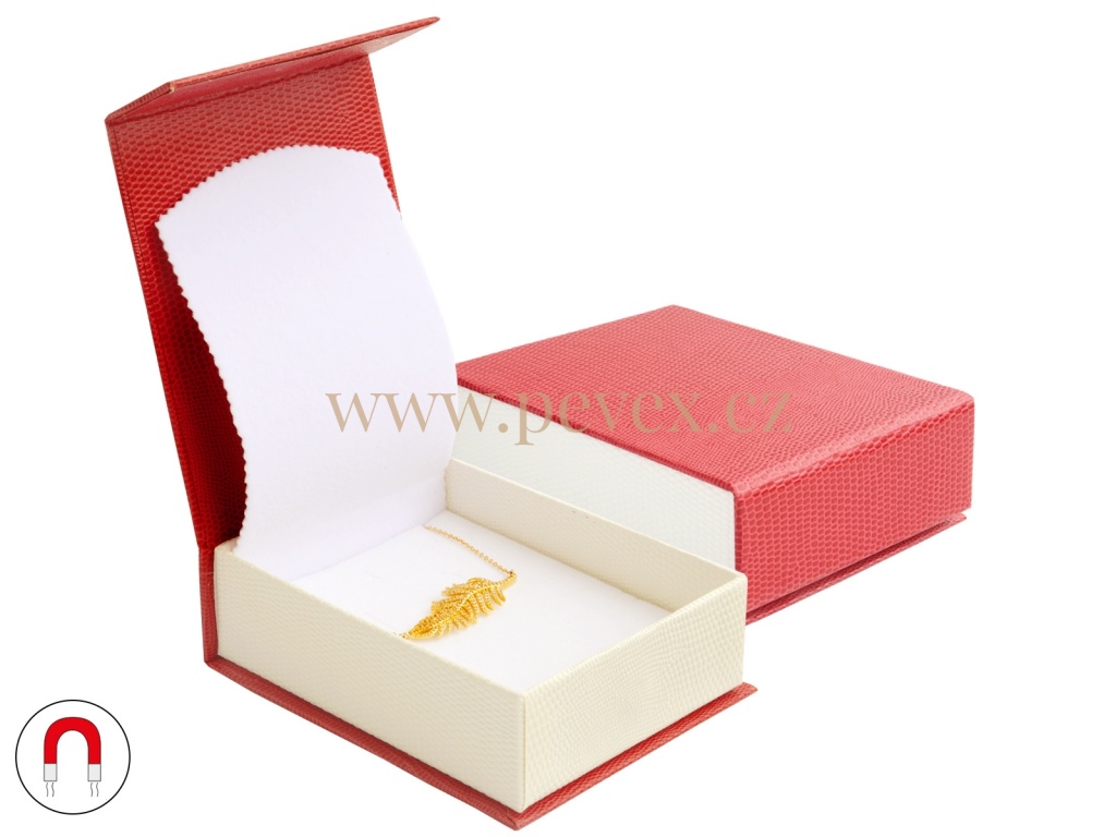 Krabičky potažené plastikovou fólií se zavíráním na magnet. Oboustanná molitanová vložka ( bílá/černá ), překryvná sametová textilie. Kombinace dvou barev.