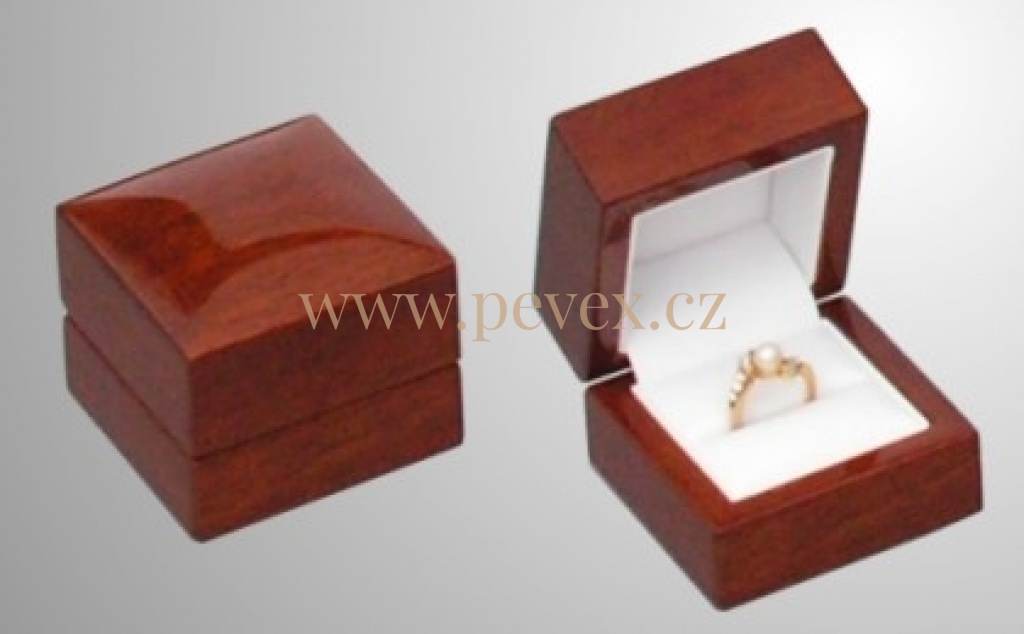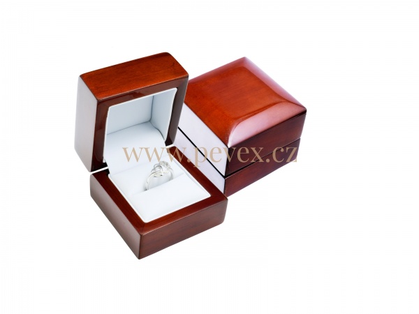 Dřevěná krabička s ořechovým lakem, vložka koženková s polstrováním pro uložení prstenu.