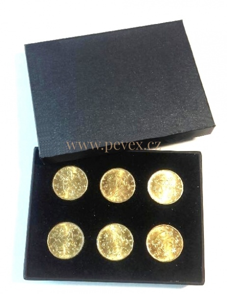 Krabička pro uložení 6 mincí 20 Kč s prohlubněmi na minci. Vhodná pro sady mincí, které vydala ČNB ke 100. výročí založení ČSR a založení měny.