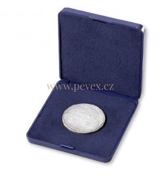 Krabička plastová 10 x 10 cm modrá s paměťovou vložkou pro mince. Zamáčknutím mince se vytvoří lůžko pro minci. Je tímto universální i pro nestandardní tvary plaket.