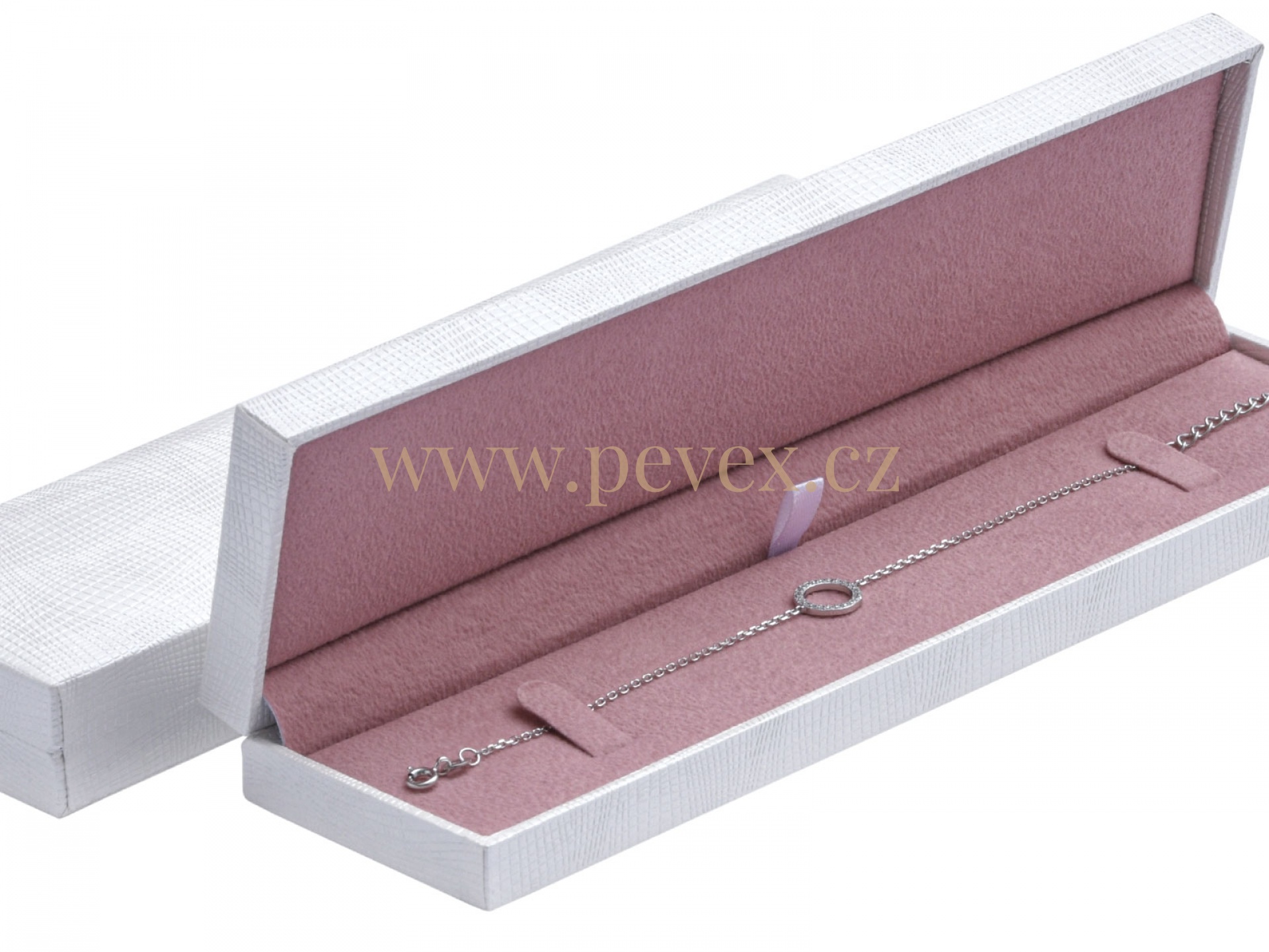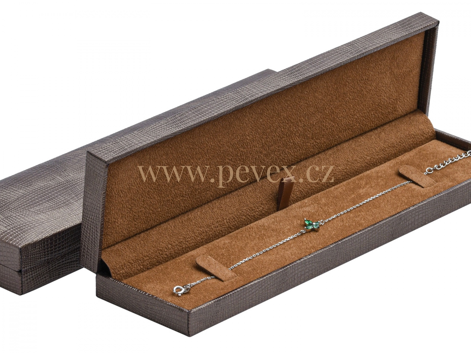 Luxusní krabička potažená strukturovaným plastikem se sametovou vložkou pro náramek.