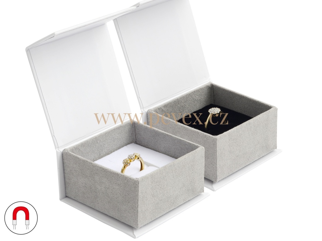 Papírová krabička na šperky s magnetickým zavíráním, oboustranná molitanová vložka pro prsten, náušnice nebo snubní prsteny a manžetové knoflíčky. Spodní díl potažený sametem.