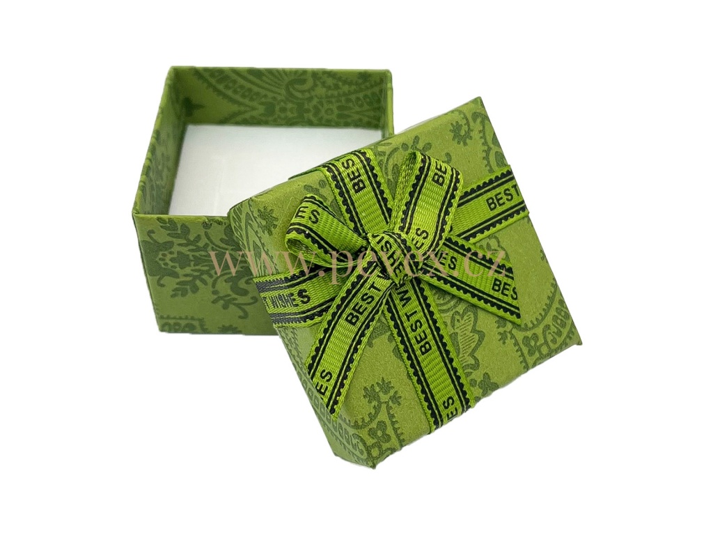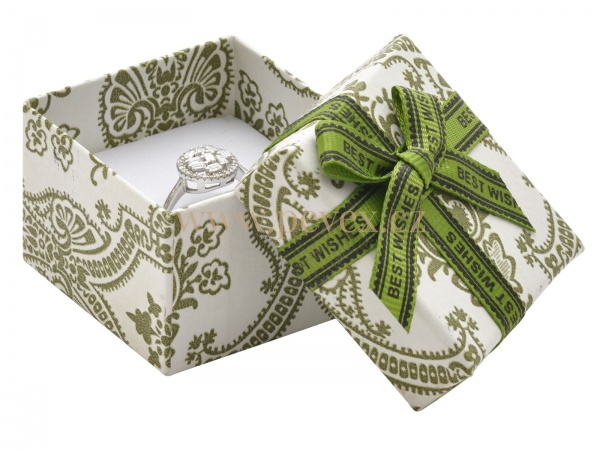 Papírová krabička na šperky s potištěnou mašlí. Molitanová vložka s průseky pro prsten nebo náušnice.