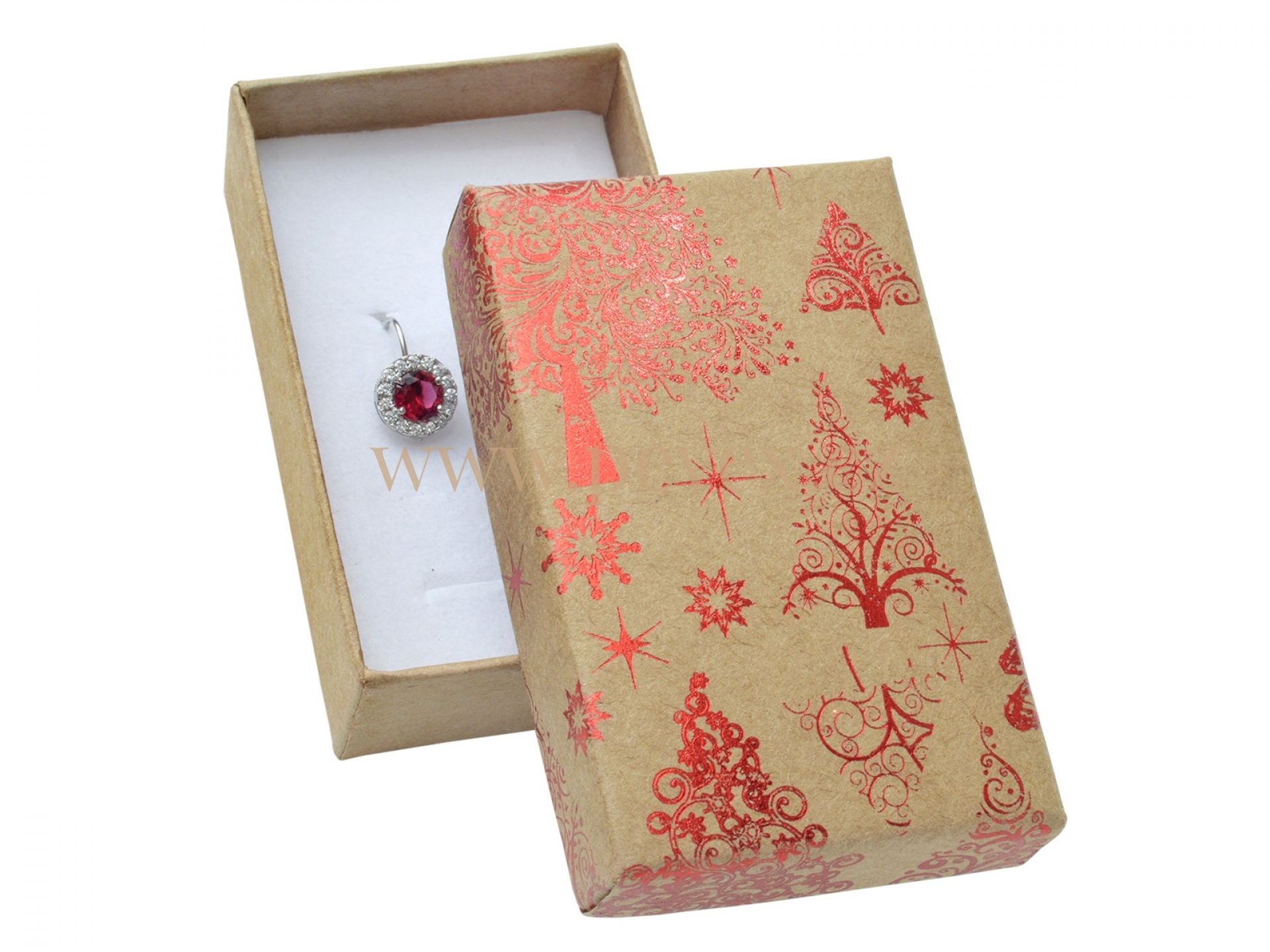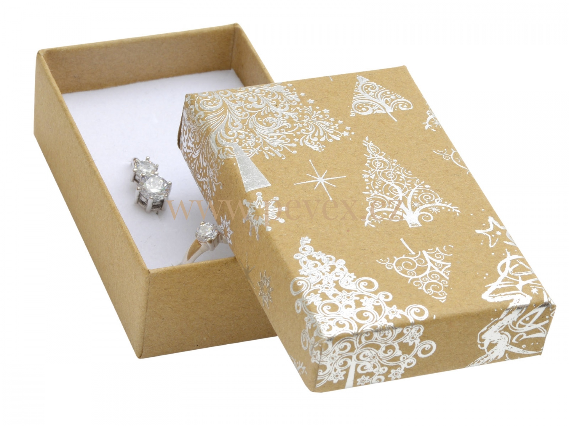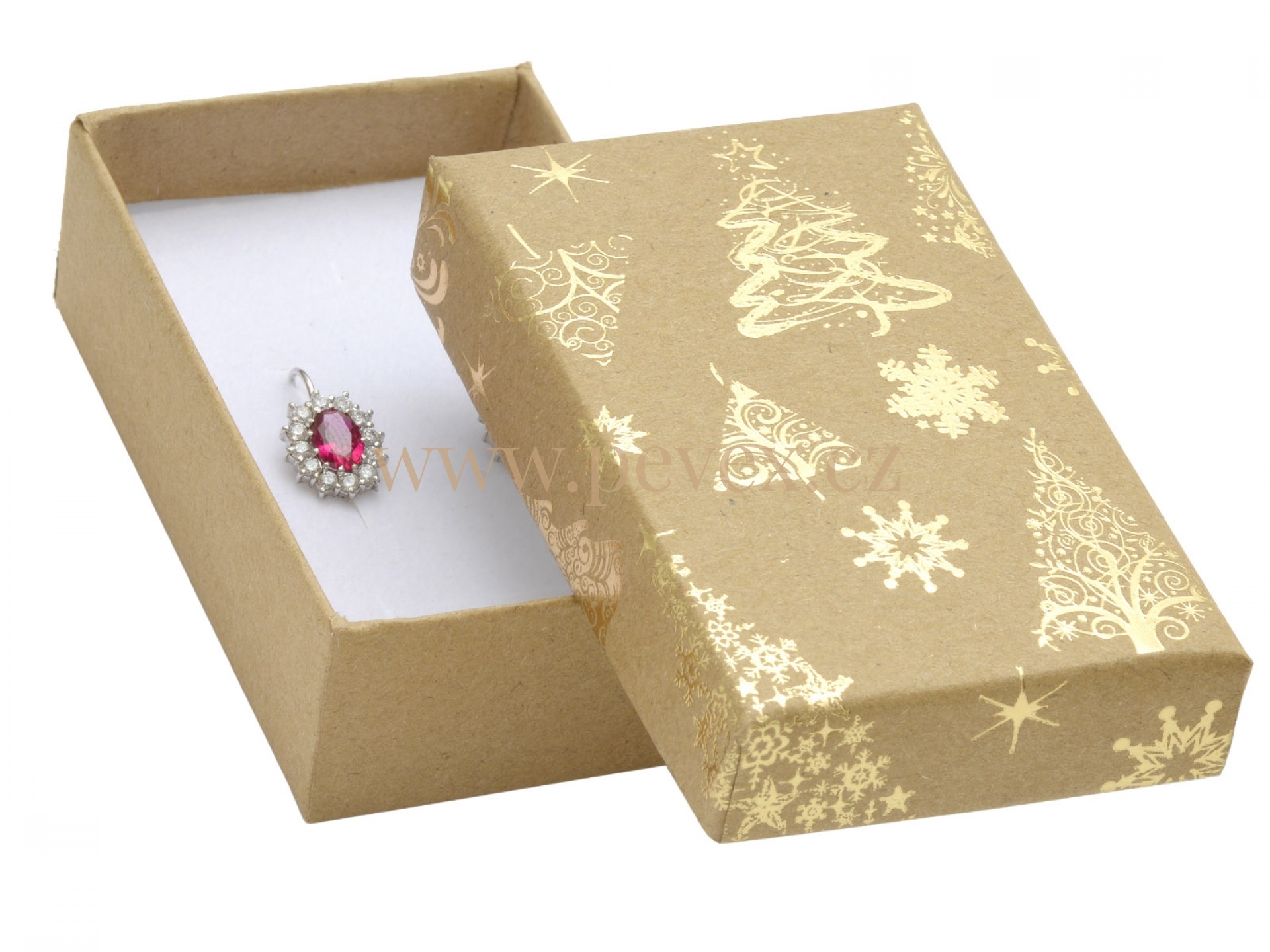 Krabička z přírodního papíru s vánočním motivem. Molitanová vložka s průseky na malou soupravu šperků.