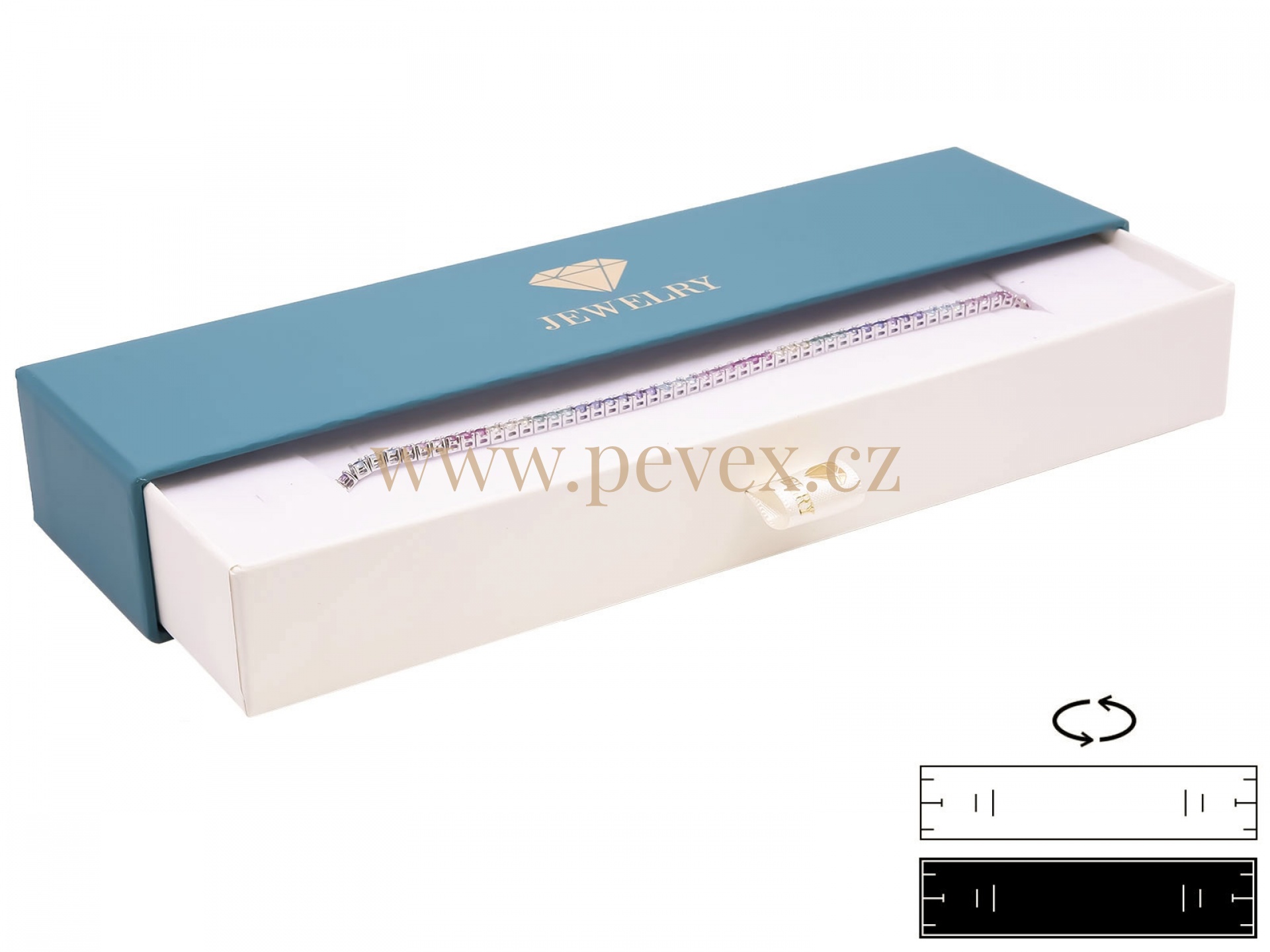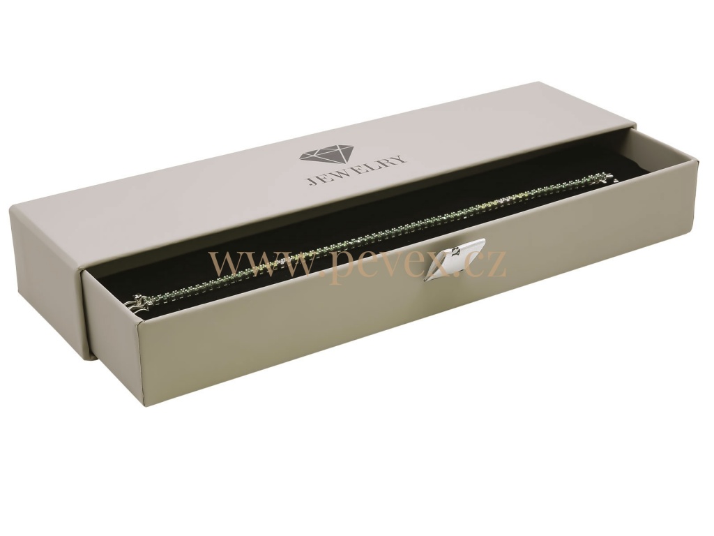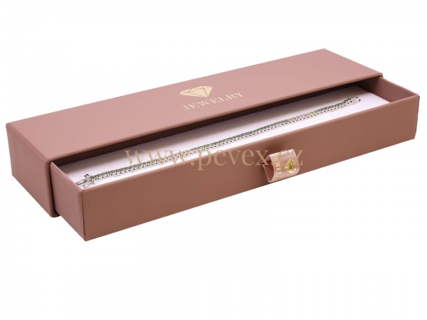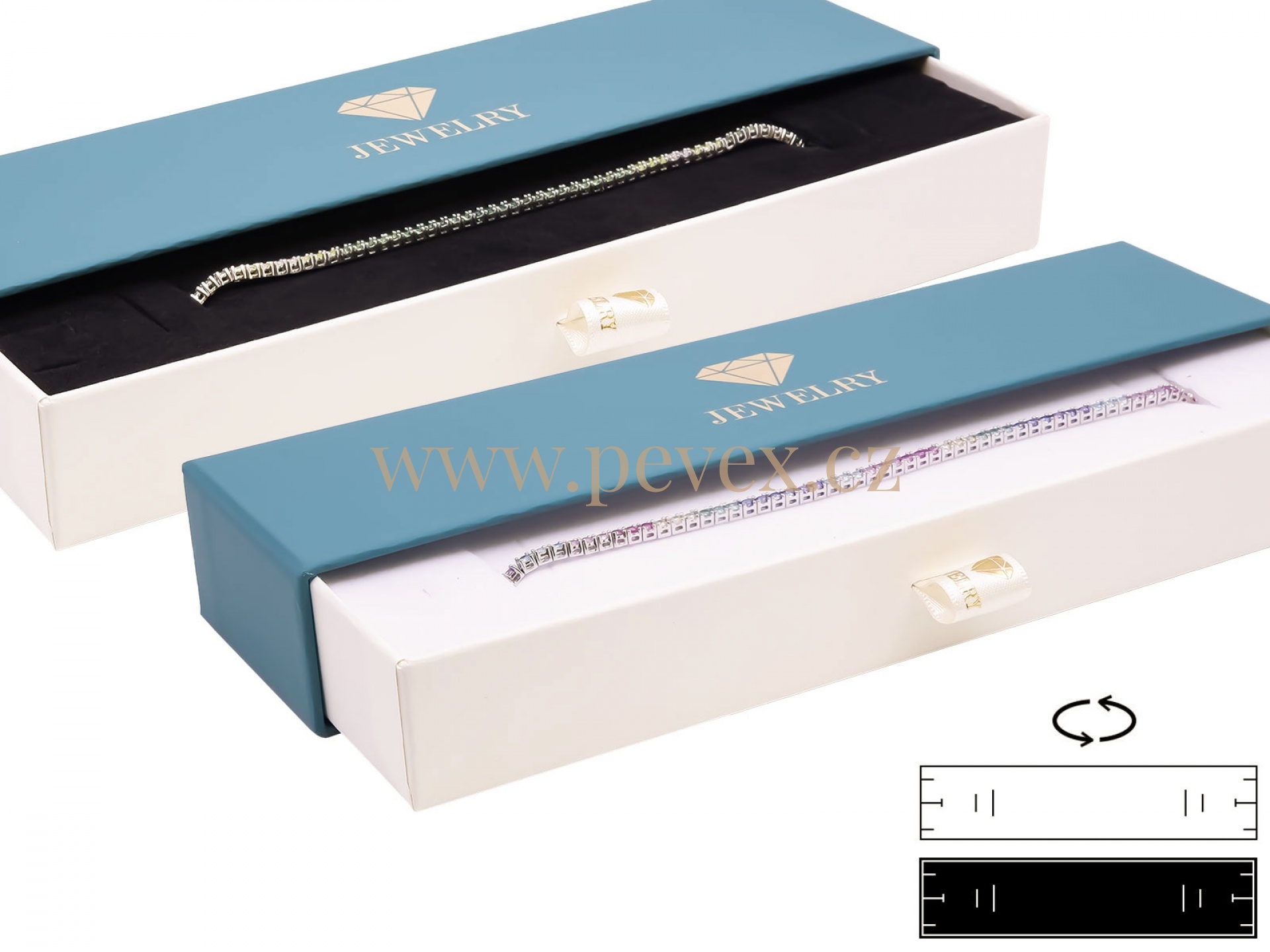 Papírová krabička s vložkou pro náramek a ražbou loga Jewelry na vrchní straně a stužce.