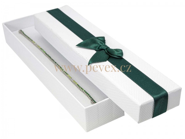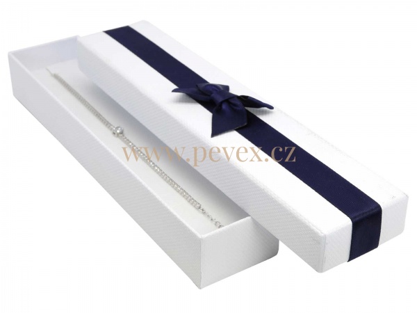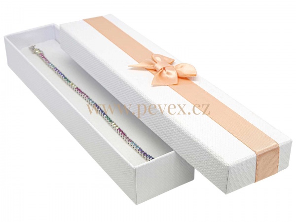 Papírová krabička s mašlí a molitanovou vložkou pro náramek.