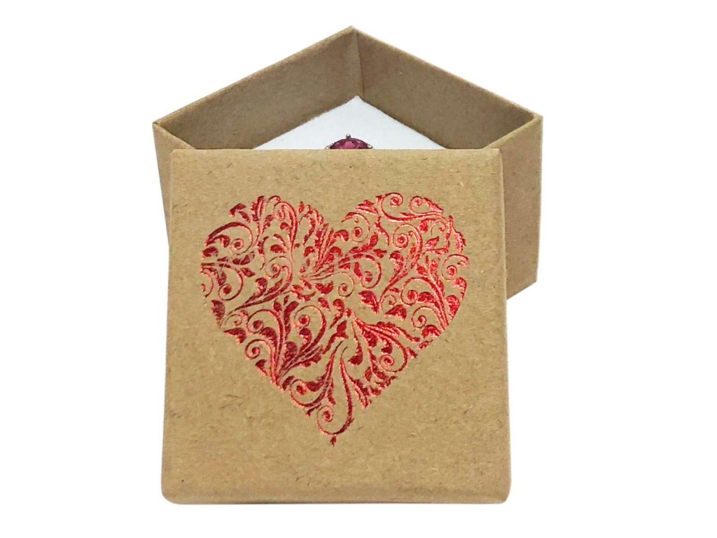 Papírová krabička z přírodního papíru s potiskem srdce. Molitanová vložka s průseky na prsten nebo náušnice.