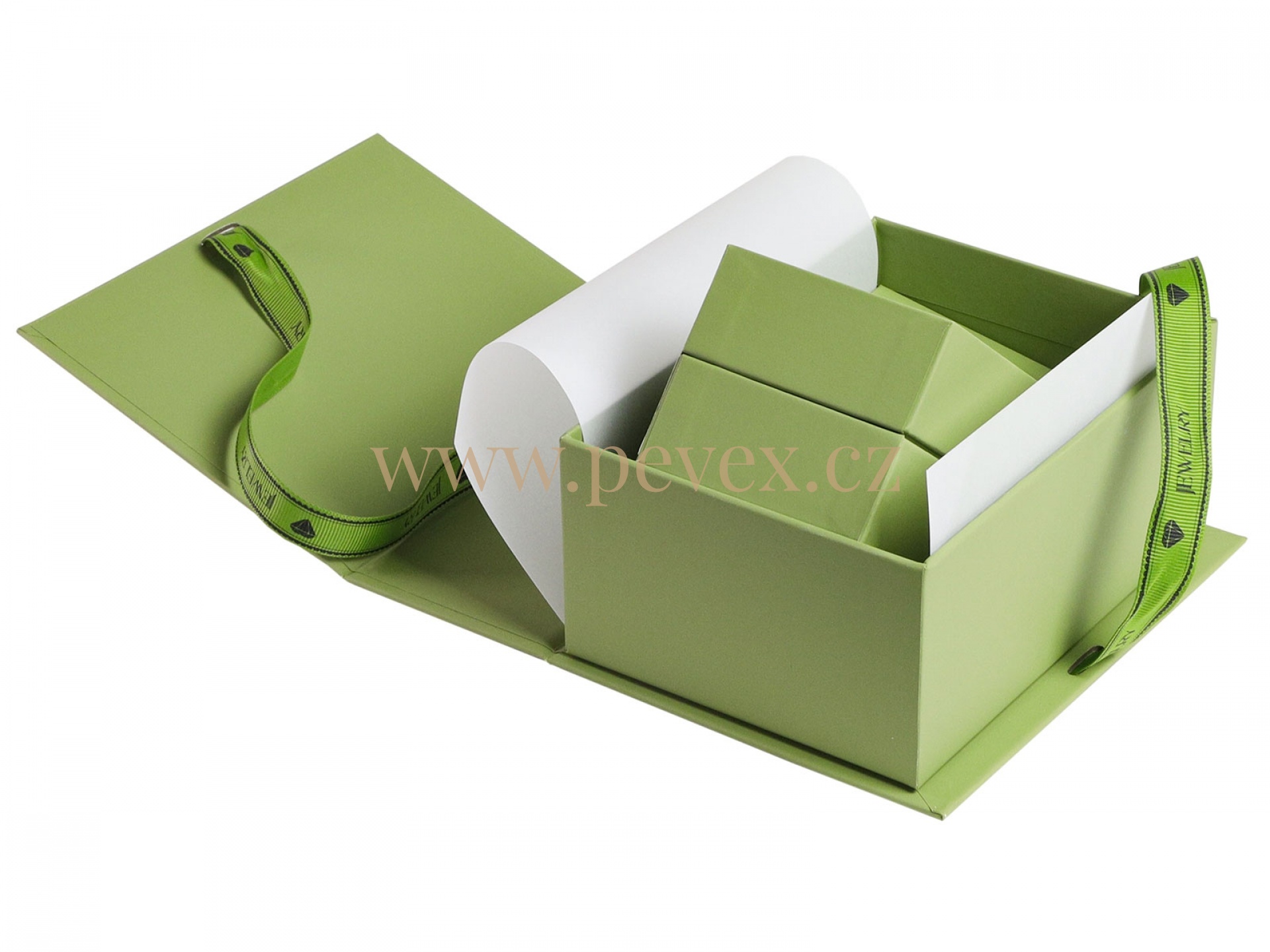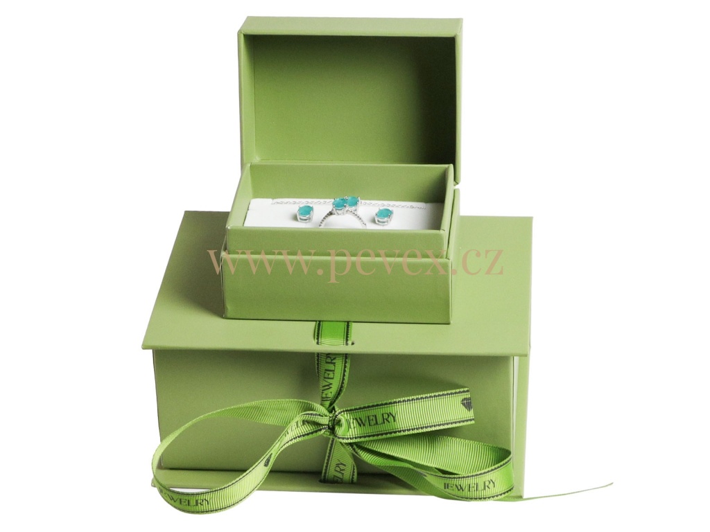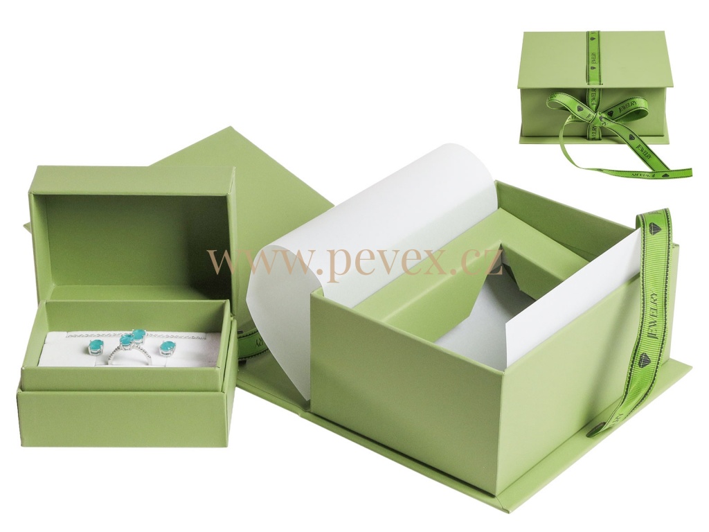 Dárková krabička s mašlí 167 x 130 x 75 mm s vloženou menší krabičkou na malou sadu šperků 100 x 70 x 65 mm. Zavírání na stuhu.