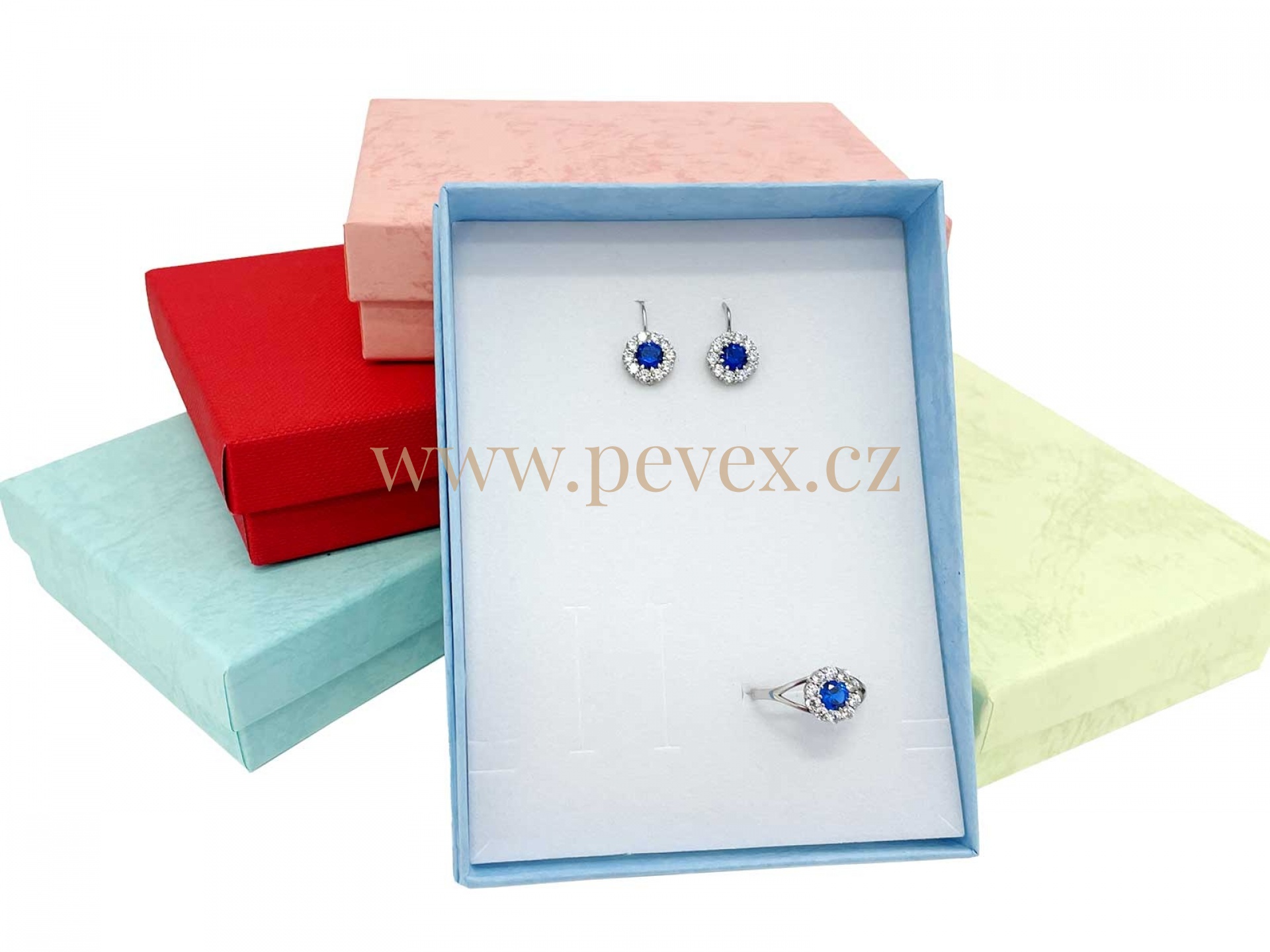 Papírové krabičky v mixu barev s molitanovou vložkou pro větší soupravu šperků.