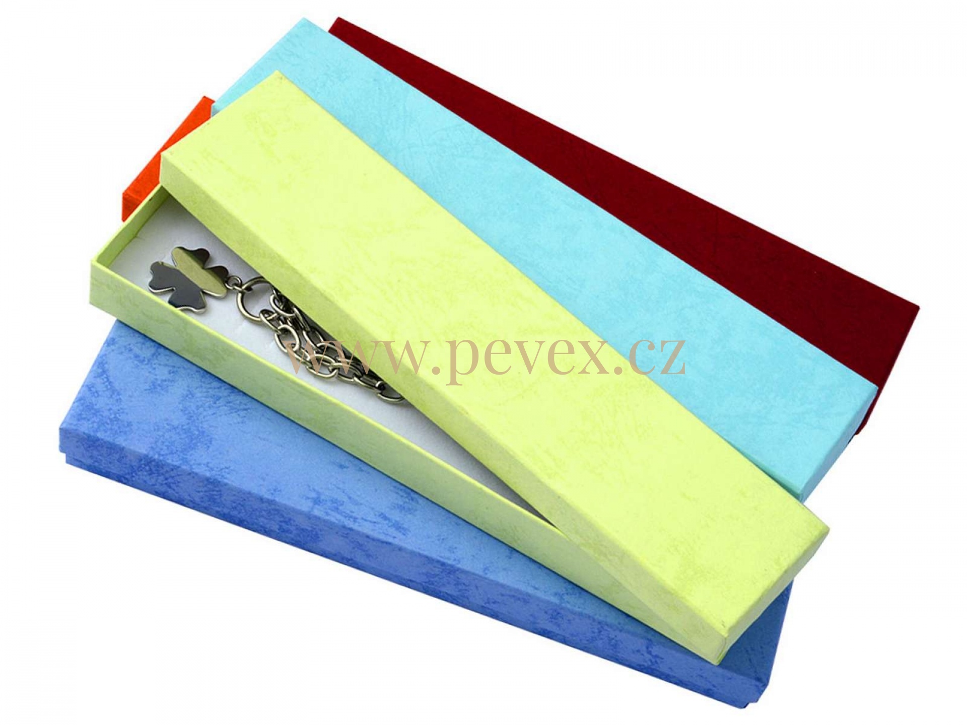 Papírové krabičky v mixu barev s molitanovou vložkou pro náramek.