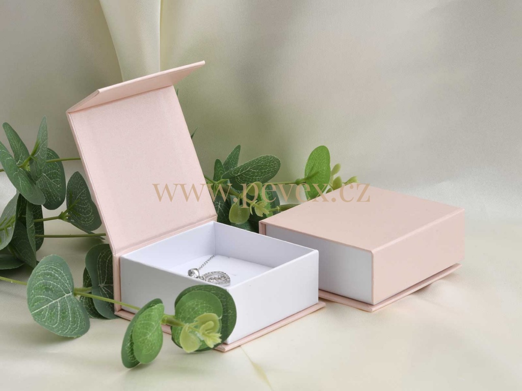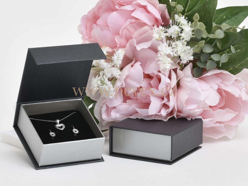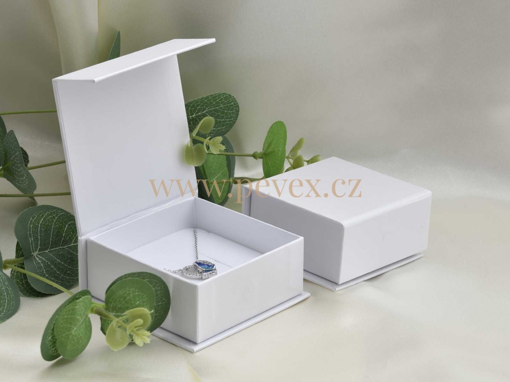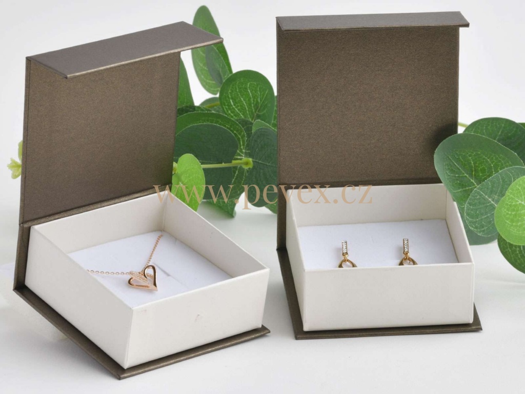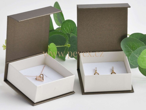 Papírová krabička na šperky s magnetickým zavíráním, molitanová vložka s průseky na menší sadu šperků.