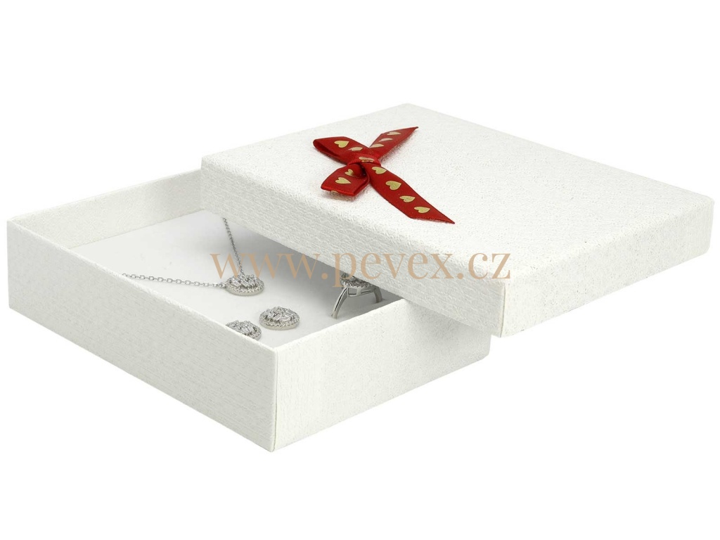 Papírová krabička s potištěnou mašlí srdce. Molitanová vložka s průseky na soupravu šperků.