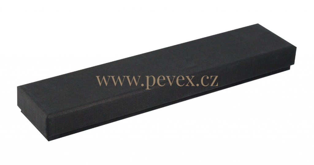 Papírová krabička potažená strukturovaným papírem imitací plátna. Molitanová vložka s průseky pro náramek.