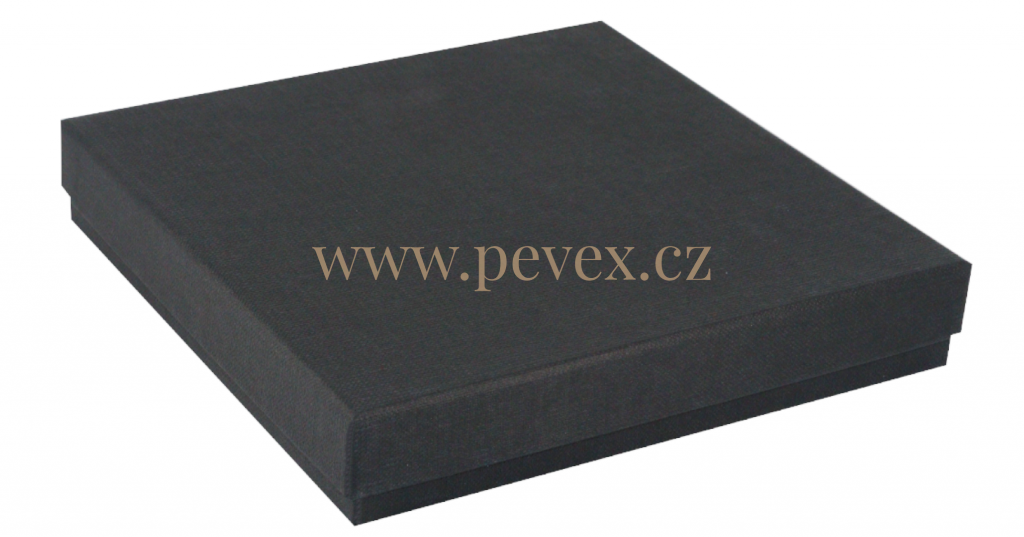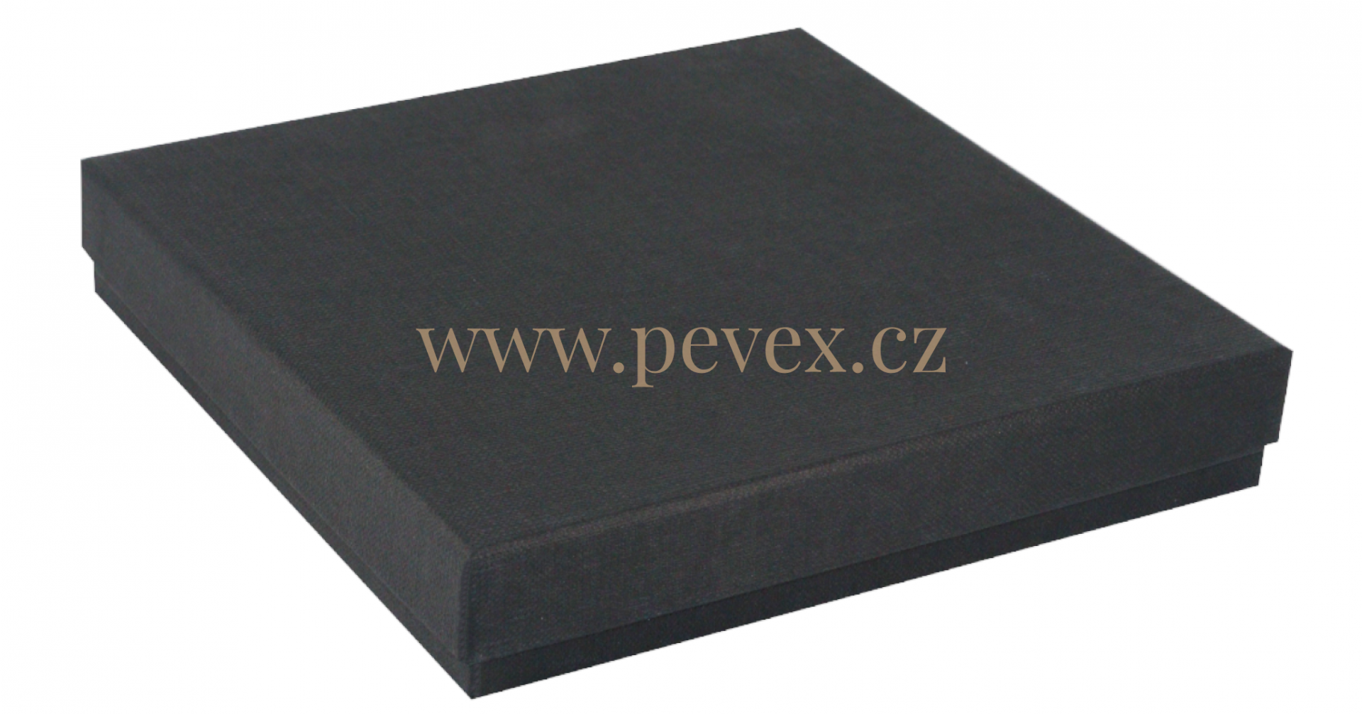 Papírová krabička potažená imitací plátna vhodná pro soupravu šperků. Molitanová vložka s průseky.