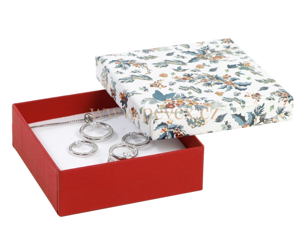 Papírová krabička potažená papírem s vánočním motivem. Molitanová vložka na střední soupravu šperků.
