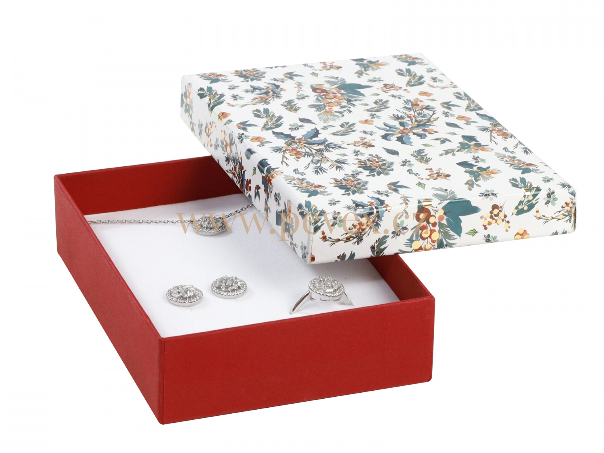 Papírová krabička potažená papírem s vánočním motivem. Molitanová vložka s průseky pro soupravu šperků.