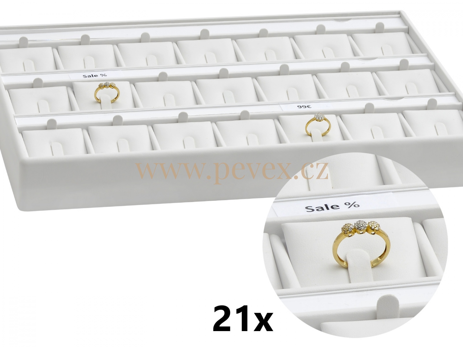 Předkládací koženkové plato pro 21 ks prstenů. Možnost vložení cenovky.