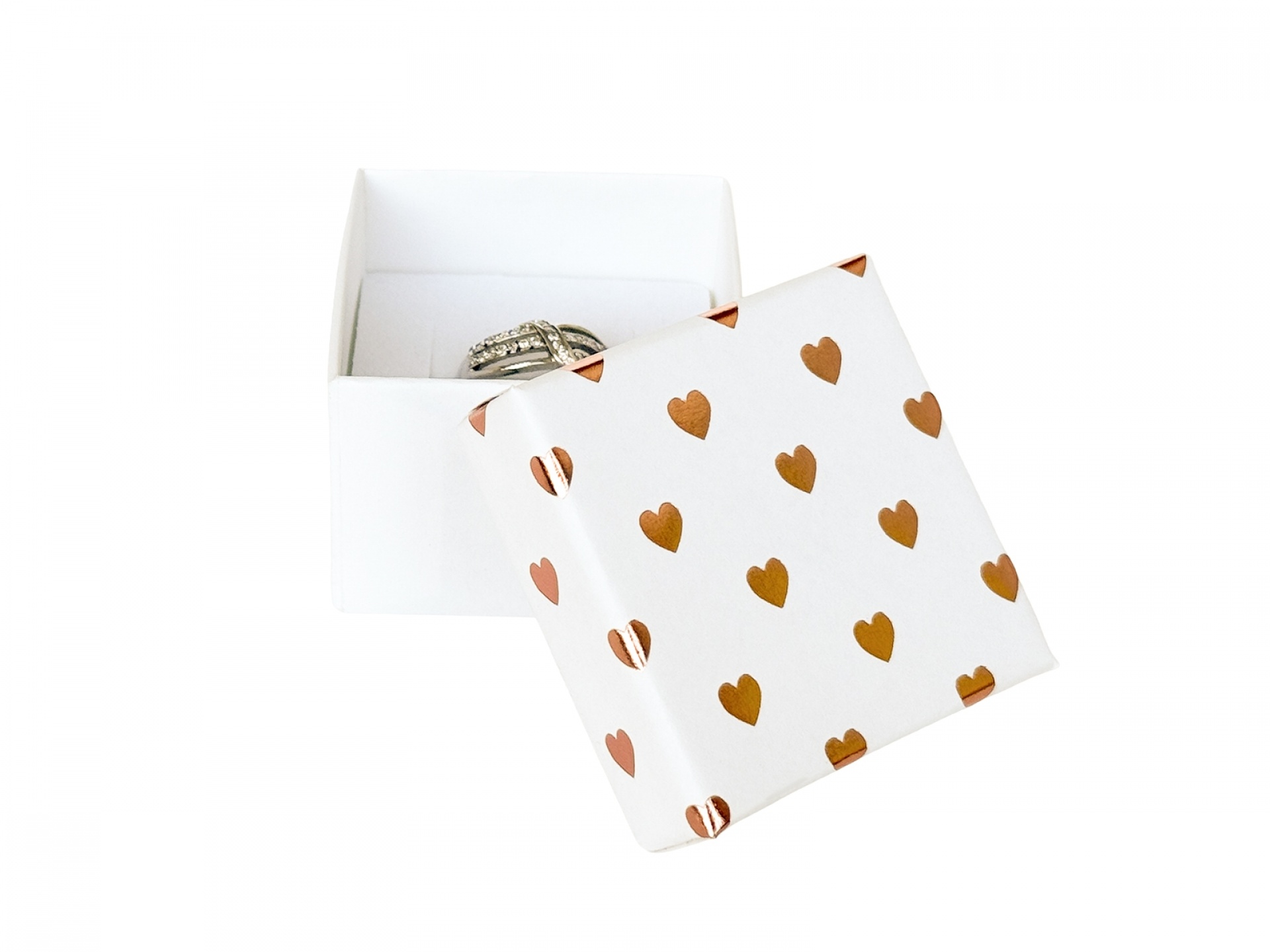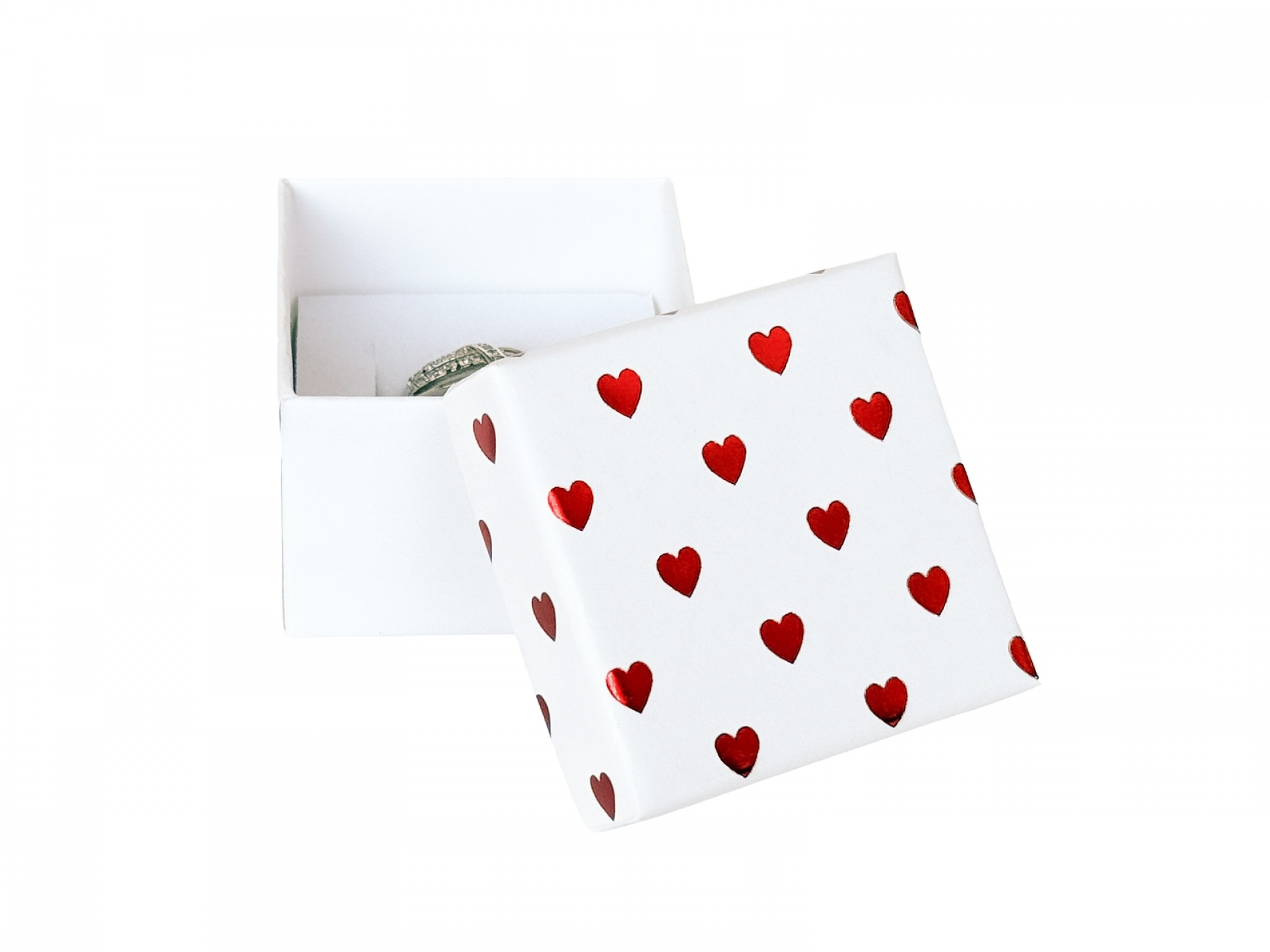 Papírové krabičky na šperky s potiskem srdíček. Molitanová vložka s průseky na šperky.
