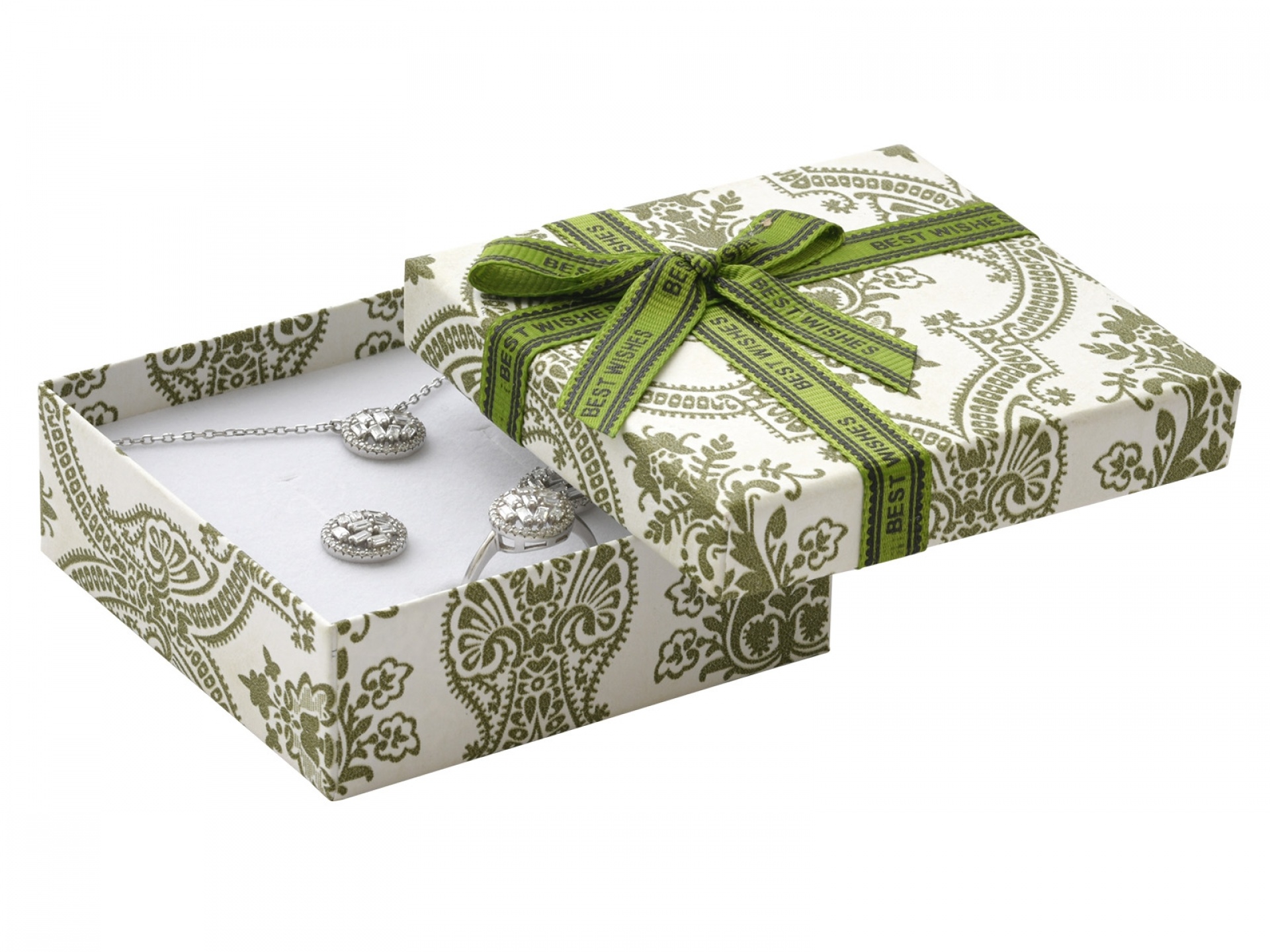 Papírové krabičky s potištěnou mašlí. Molitanová vložka s průseky na šperky.