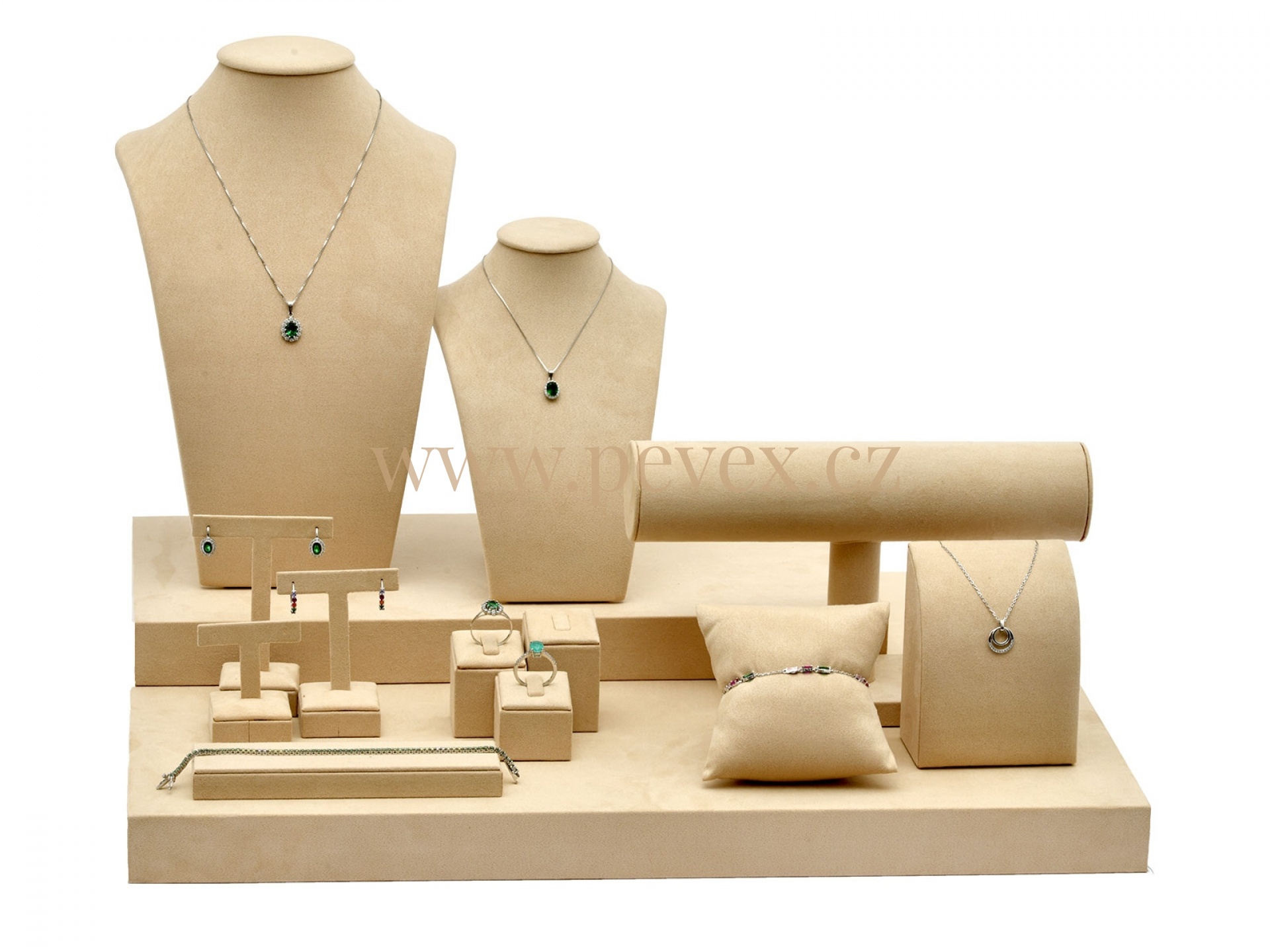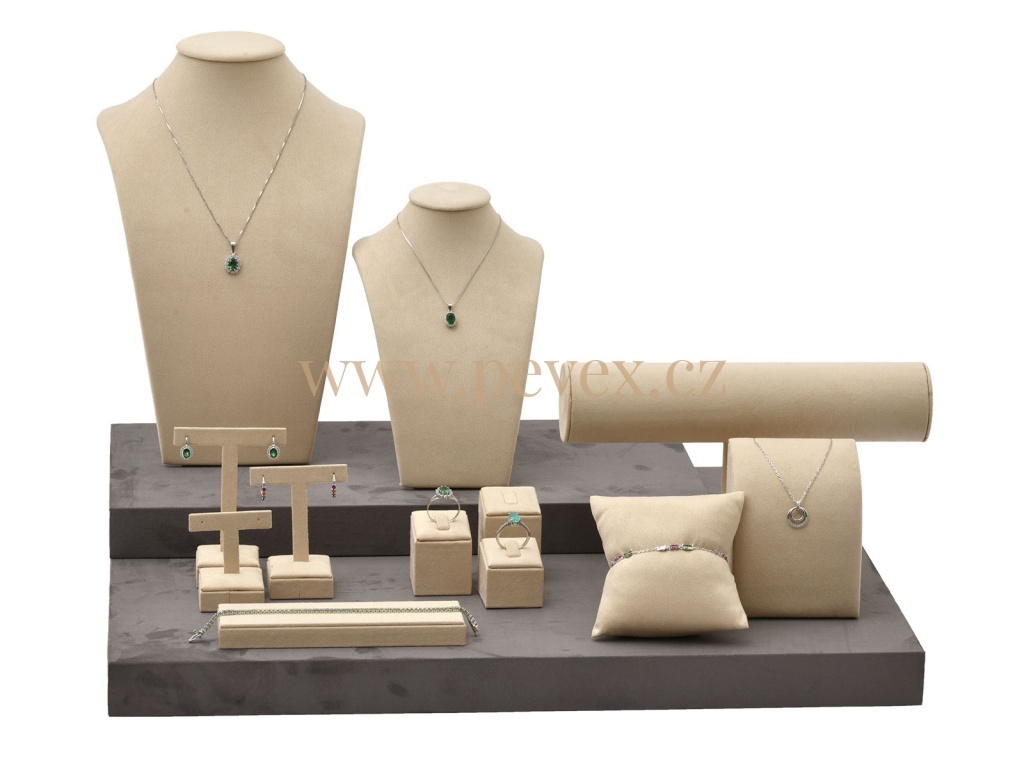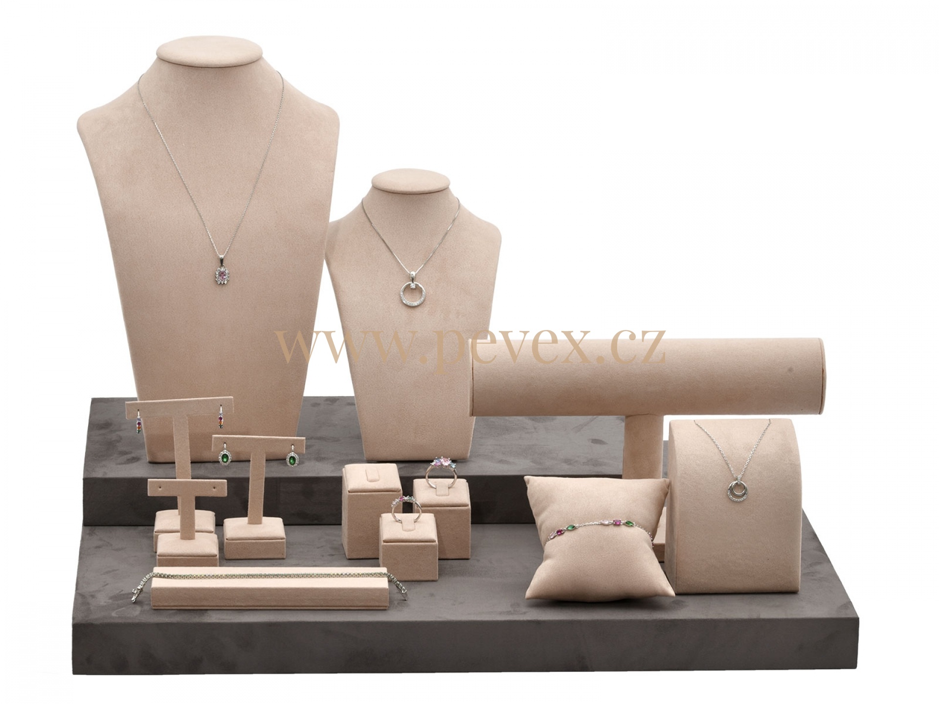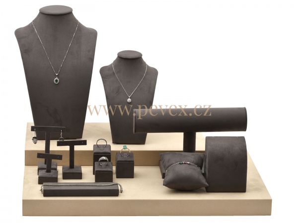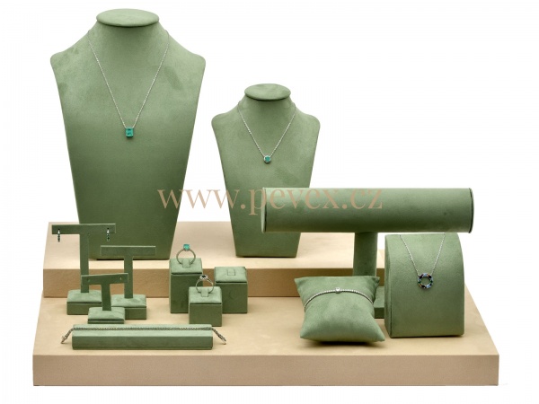 Výlohový arenžéský set na vystavení šperků. Komponenty potažené barevnou koženkou.