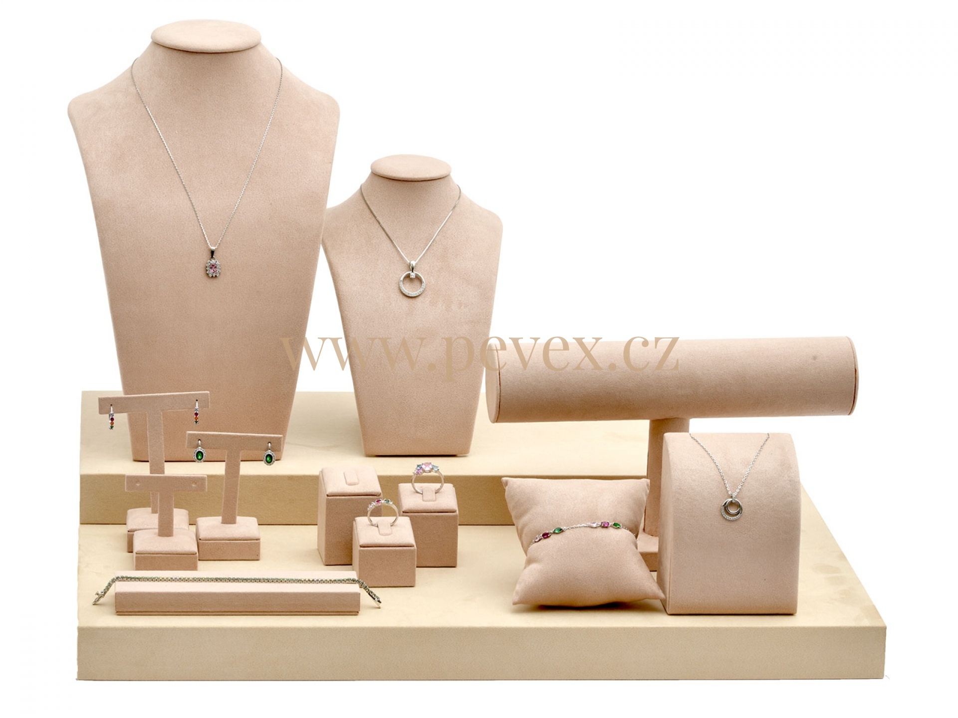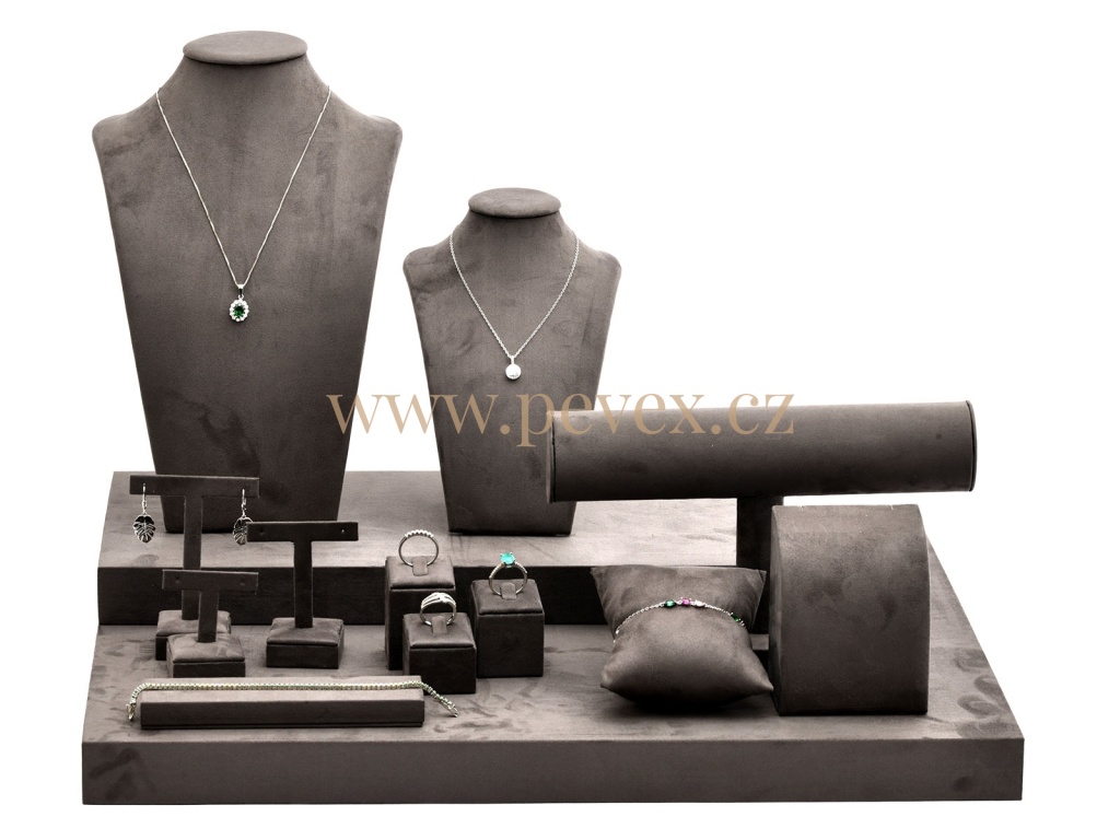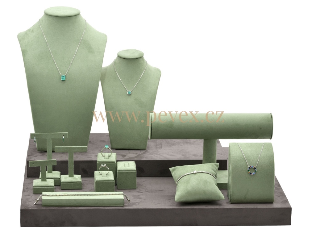 Výlohový arenžéský set na vystavení šperků. Komponenty potažené barevnou koženkou.