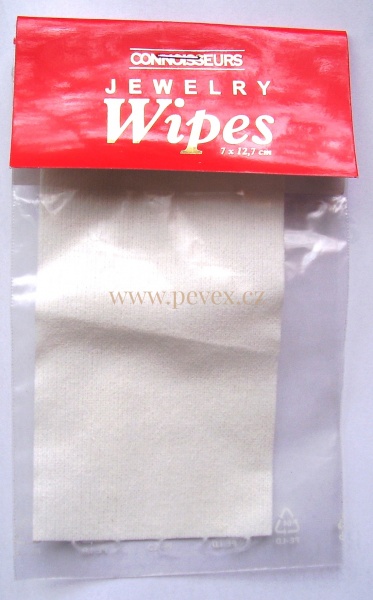 Kapesníčky na čištění šperků jsou přebalené po 1 ks z originál krabičky Universální utěrky WIPES 25 ks.